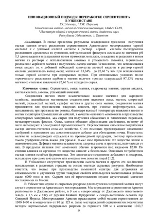В статье приведены результаты исследования процессов получения оксида магния путем разложения серпентинитов Арватенского месторождения серной кислотой и с добавкой азотной кислоты в раствор серной кислоты последуюшим разделением кремнезема из суспензии, нейтрализацией фильтрата аммиаком до значения рН 8,5 для осаждения и раздаеления ионов примесных металлов, осаждение и разделения ионов магния из раствора с использованием аммиака и углекислого аммония, термическое разложение корбаната магния с получением оксида магния. Установлено, что использования смесь кислот т.е. с добавкой небольшой количества азотной кислоты в раствор серной кислоты увеличиваеть выход оксид магния от 83,34% до 92,68 % чем при использования только серной кислоты при одинрковых нормах. При оптимальных условиях после термического разложения карбоната магния получен продукт содержащый 97,13% оксид магния со степенью извлечения 92,68 % от исходного сырья.