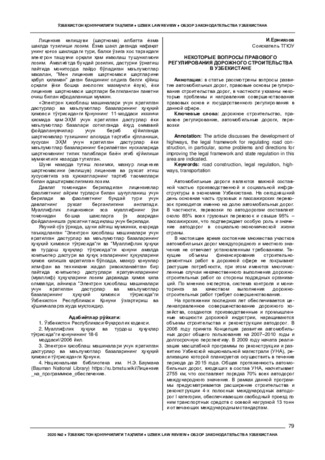 The article discusses the development of highways, the legal framework for regulating road construction, in particular, some problems and directions for improving the legal framework and state regulation in this area are indicated.