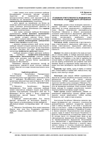 This article is devoted to the study and analysis of criminal liability of medical personnel based on national and foreign experience. The national legislation of the Republic of Uzbekistan in the field of regulating the criminal liability of medical personnel has been studied, and the existing achievements and problems have been identified. Based on progressive foreign experience, proposals have been developed to improve legislation in this area.
