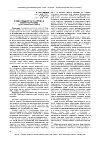 At the present stage of development of society, the issues of conflict regulation of relations in cyberspace or the emergence of conflict of laws cyber law are becoming more and more relevant. The article analyzes the issues of regulation of relations in cyberspace in connection with private international law. In particular, the issues of conflict of law are being updated in the frame- work of relations related to smart contracts, blockchain technologies, electronic platforms and e-commerce in connection with several jurisdictions. In the conclusion, it is noted that private international law is the most positive cross-sectoral base for the implementation of legal innovations taking into account cyberspace, and private international private law can become the base for the regulating of the relations in cyberspace.