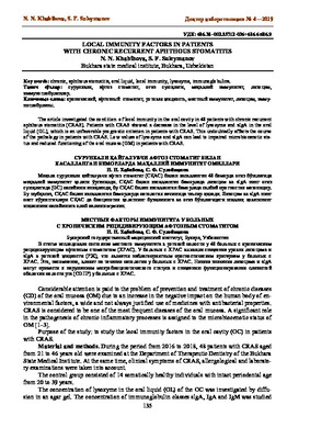 • В статье исследовали состояние местного иммунитета в ротовой полости у 48 больных с хроническим рецидивирующим афтозным стоматитом (ХРАС). У больных с ХРАС выявили снижение уровня лизоцима и slgA в ротовой жидкости (РЖ), что является неблагоприятным прогностическим критерием у больных с ХРАС. Это, несомненно, влияет на течение патологии у больных с ХРАС. Низкие значения лизоцима и slgA могут привести к нарушениям микробиоценотического статуса и снижению функционирования слизистой оболочки полости рта (СОПР) у больных с ХРАС.