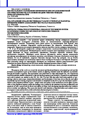 • Цель работы - выявить структурно-функциональные особенности постнатального роста и формирования периферических органов иммунной системы потомства, полученного под влиянием пестицидов через организм матери. Эксперименты выполнены на белых взрослых крысах-самках, получавших соответственно пестициды лямбда-цигалотрин или фипронил в период беременности и лактации. Потомство от опытных и контрольных животных исследовали на 3, 7, 14, 21 и 30 сутки после рождения методами морфологии, электронной микроскопии, иммуногистохимии и биохимии. Показано, что токсический эффект воздействия пестицидов в период беременности и лактации проявляется в виде задержки роста и формирования периферических иммунных органов – лимфатических узлов и селезенки. В механизме токсического действия пестицидов на периферическую иммунную систему ведущую роль играет нарушение баланса между пролиферацией и апоптозом клеток, обусловленное как прямым токсическим действием препаратов, так и развитием гипотиреоза и окислительного стресса у матери и потомства. Это вызывает необходимость раннего выявления гипотиреоза и оксидативного стресса у беременных и новорожденных с последующей их фармакологической коррекцией.