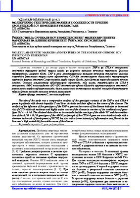 • Цель исследования — сравнительный анализ генотипических вариантов генов TNF-α и CTLA-4 у больных хроническим гепатитом С и циррозом печени и их влияние на течение заболевания. Анализ влияния генотипов гена TNF-α на течение заболевания свидетельствует о повышенном риске ССЗ как при среднетяжелом, так и при высокоактивном течении заболевания у носителей комбинации генотипов G/A+A. /A. Полученные данные позволяют сделать вывод, что носительство аллеля «G» и сочетание генотипов A/G+G/G полиморфа -49GG гена CTLA-4 связаны не только с снижение риска развития HCVF, но и при меньшей выраженности воспаления и фиброза в печени и высокой вероятности благоприятного течения заболевания.