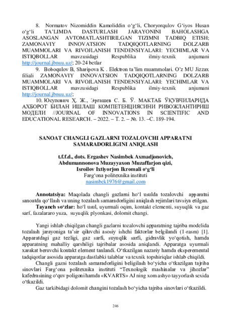 • Maqolada changli gazlarni ho‘l usulda tozalovchi apparatni sanoatda qo‘llash va uning tozalash samaradorligini aniqlash rejimlari tavsiya etilgan.