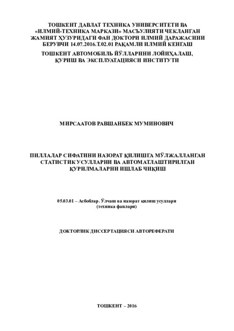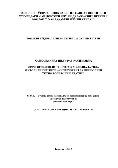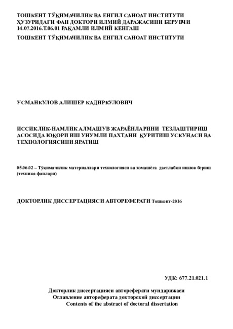 • Актуальность и востребованность темы диссертации. Важнейшей задачей, поставленной государством перед текстильной промышленностью, является достижение устойчивого места текстильной продукции на международном рынке и внести вклад в завоевании уровня экономически развитых стран мира. Президент Республики Узбекистан Ислам Каримов в своих работах подчеркивает: «Особое внимание должно быть обращено на дальнейшее развитие производства, прежде всего в легкой, текстильной и пищевой промышленности, по более углубленной переработке хлопка-волокна, другой сельскохозяйственной продукции и сырьевых ресурсов, промышленности строительных материалов, организацию выпуска готовой качественной продукции, пользующейся устойчивым спросом»1.