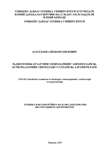 На основе проведённых исследований доктора философии (PhD) по техническим наукам на тему «Методы и алгоритмы синтеза элементов и устройств радиотехнических следящих систем» представлены следующие выводы: