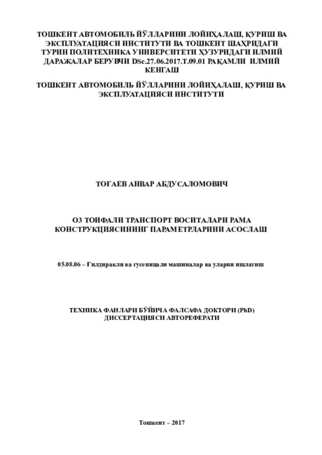 На основе результатов исследований, проведенных по теме «Обоснование параметров рамных конструкций транспортных средств категории ОЗ» диссертации доктора философии (PhD) представлено следующее заключение: