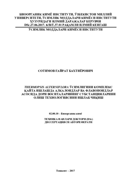 Целью исследования является создание рациональной технологии переработки надземной части Thermopsis altemiflora с последовательным выделением субстанций на основе алкалоидов цитизина, N-метилцитизина, термопсина и флавоноидов - флатерона и формононетина, а также стандартизация сырья и утилизация отходов производства.