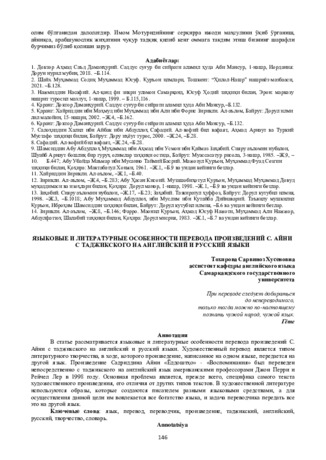 Maqolada S.Ayniy asarlarining tojik tilidan ingliz va rus tillariga tarjimasining lingvistik va adabiy xususiyatlari haqida so‘z boradi. Badiiy tarjima - bir tilda yozilgan asar boshqa tilga tarjima qilinadigan adabiy ijod turi hisoblanadi. Sadriddin Ayniyning “Yoddoshtho” – “Xotiralar” asari 1998-yilda amerikalik professorlar Jon Perri va Reychel Lehr tomonidan tojik tilidan ingliz tiliga bevosita tarjima qilingan. Asosiy