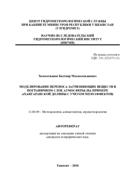 Практическая значимость: методические подходы, алгоритм, выводы и рекомендации диссертационного исследования могут быть использованы: при разработке проектов размещения предприятий, а также при мониторинге состояния атмосферы в экологически напряженных промышленных зонах долин Западного Тянь-Шаня; при картографировании состояния загрязнения промышленными выбросами. Практическая значимость работы заключается также в возможности использования материалов и результатов исследования в преподавании таких спецкурсов, как «Основы экологии», «Численные методы прогноза погоды», «Физика атмосферы», «Экологический мониторинг» и др.