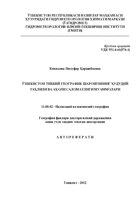 Цель работы: на основе анализа территориальной структуры заболеваемости населения разработка научно-практических рекомендаций по улучшению медико-географической обстановки в Республике Узбекистан.