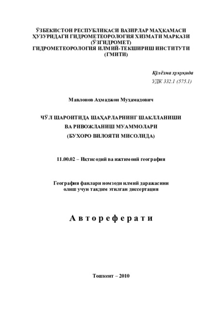 Цель работы: анализ процесса формирования городских поселений с учётом особенностей пустынных условий Бухарского вилоята, разработка на этой основе научно-практических рекомендаций по совершествованию их развития.