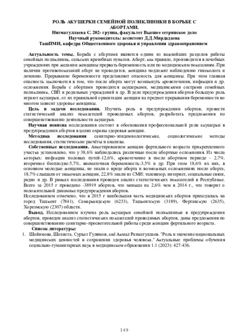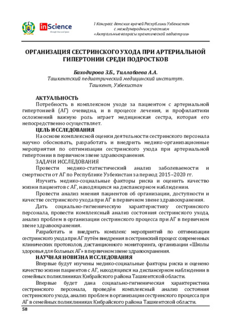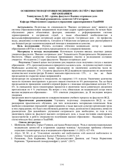 • Подготовка по специальности "Высшее сестринское дело" является для системы образования новым направлением подготовки кадров здравоохранения. Ее начало было обусловлено рядом объективных факторов, связанных с реформированием системы здравоохранения и сестринских служб, а также объективной необходимостью в высококвалифицированных сестринских кадрах для отрасли. Сестринское дело - это профессия, наука, дисциплина и ответственность. Сегодня и в Узбекистане сестринское дело рассматривается как большой ресурс оказания медицинской помощи и повышения ее качества.