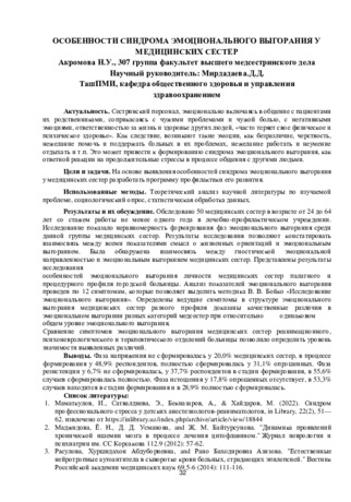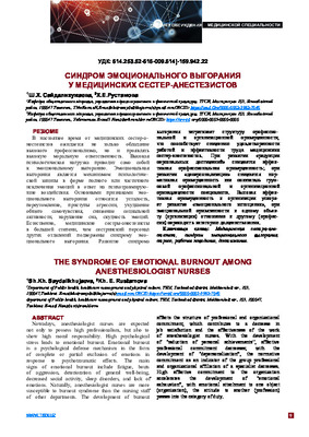 • В настоящее время от медицинских сестер-а нестезистов ожидается не только обладание высокого профессионализма., но и проявлять высокую моральную ответственность. Высокая психологическая нагрузка приводит само собой к эмоциональному выгоранию. Эмоциональная выгорания является механизмом психологине ской защиты в форме полного или частичного исключения эмоций в ответ на пснхотравмирую щие воздействия. Основными признаками эмо ционального выгорания относятся усталость, переутомление, приступы агрессин, ухудшение общего самочувствия, снижение социальной активности, нарушение сна, скудность эмоций. Естественно, медицинские сестры-анестезисты в большей степени, чем сестринский персонал других отделений подвержены синдрому эмо ционального выгорания. Развитие синдромавыгорания затрагивает структуру профессио нальной и организационной приверженности., что способствует снижению удовлетворенности работой и эффективности труда медицинских сестер-анестезистов. При развитии «редукции персональных достижений» снижается аффек тивная профессиональная приверженность; при развитии «деперсонализации» снижается нор мативная приверженность как показатель труп повой профессиональной и организационной принадлежности специалиста. Высокая аффек тивная приверженность к организации ускоря ет развитие «эмоционального истощения», при эмоциональной привязанности к одному объек ту (организации) отношение к другому (профес сии) переходит в категорию долженствования.