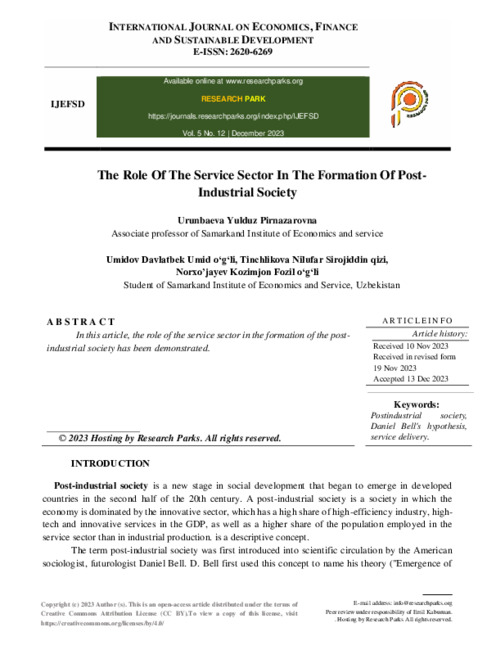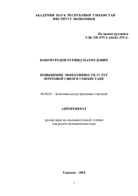 Практическая значимость: основные научные результаты и выводы служат повышению уровня эффективности услуг в ОАО “Узбекистан почтаси” и её филиалах. Отдельные научные идеи и рекомендации также могут применяться в прсподовании специальных дисциплин таких как, “Теоритеческие основы почтовой службы”, “Экономика предприятий (Почтовая служба)”, “Организация и планирование предприятий почтовой связи”, “Экономика связи и информатизации” в Ташкентском университете информационных технологий.