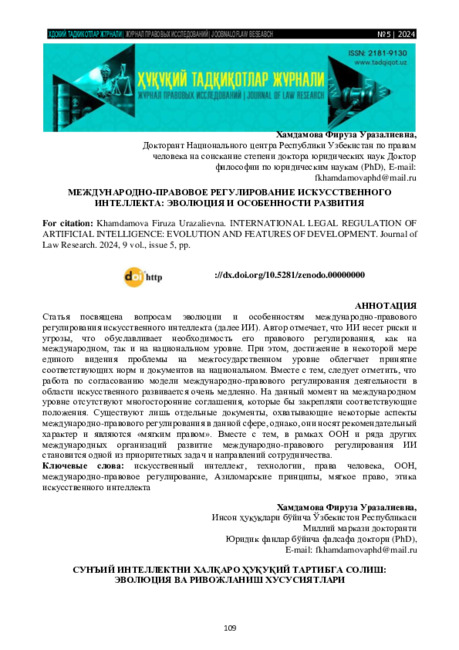 Статья посвящена вопросам эволюции и особенностям международно-правовою регулирования искусственного интеллекта (далее ИИ). Автор отмечает, что ИИ несет риски и угрозы, что обуславливает необходимость его правового регулирования, как на международном, так и на национальном уровне. При этом, достижение в некоторой мере единого видения проблемы на межгосударственном уровне облегчает принятие соответствующих норм и документов на национальном. Вместе с тем, следует отметить, что работа по согласованию модели международно-правового регулирования деятельности в области искусственного развивается очень медленно. На данный момент на международном уровне отсутствуют многосторонние соглашения, которые бы закрепляли соответствующие положения. Существуют лишь отдельные документы, охватывающие некоторые аспекты международно-правового регулирования в данной сфере, однако, они носят рекомендательный характер и являются «мягким правом». Вместе с тем, в рамках ООН и ряда других международных организаций развитие международно-правового регулирования ИИ становится одной из приоритетных задач и направлений сотрудничества.