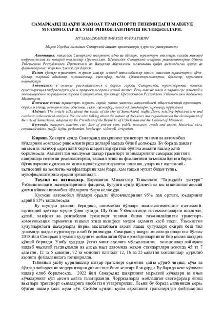 В статье рассказывается о дороги города Самарканда, транспортные потоки, существующая инфраструктура и проведен теоретический анализ. Речь также идет о характере решений и постановлений по развитию города Самаркандна, принятых Президентом Республики Узбекистан и Кабинета Министров.