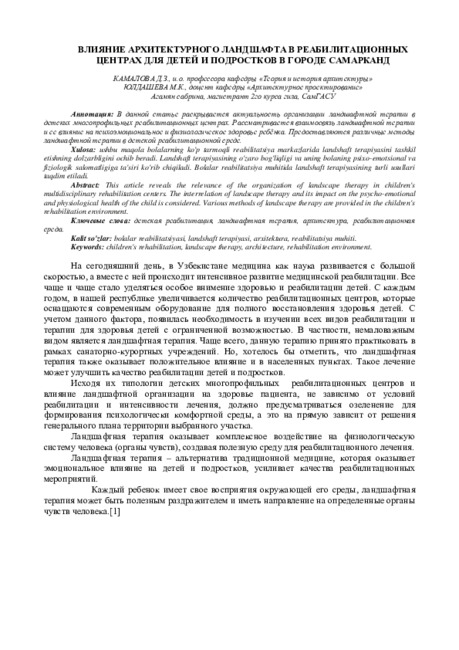 В данной статье раскрывается актуальность организации ландшафтной терапии в детских многопрофильных реабилитационных центрах. Рассматривается взаимосвязь ландшафтной терапии и ее влияние на психоэмоциональное и физиологическое здоровье ребёнка. Предоставляются различные методы ландшафтной терапии в детской реабилитационной среде.