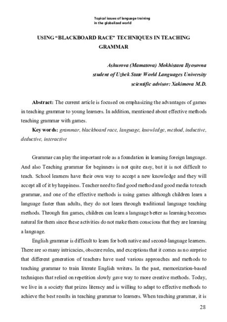 The current article is focused on emphasizing the advantages of games in teaching grammar to young learners. In addition, mentioned about effective methods teaching grammar with games.