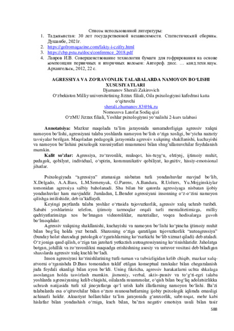 Mazkur maqolada ta’lim jarayonida samaradorligiga agressiv xulqni namoyon bo‘lishi, agressiyani talaba yoshlarda namoyon bo‘lish o‘ziga xosligi, bo‘yicha nazariy tavsiyalar berilgan. Maqoladan pedagogik jarayonida agressiv xulqning shakllanishi, kuchayishi va namoyon bo‘lishini psixologik xususiyatlari muammosi bilan shug’ullanuvchilar foydalanish mumkin.