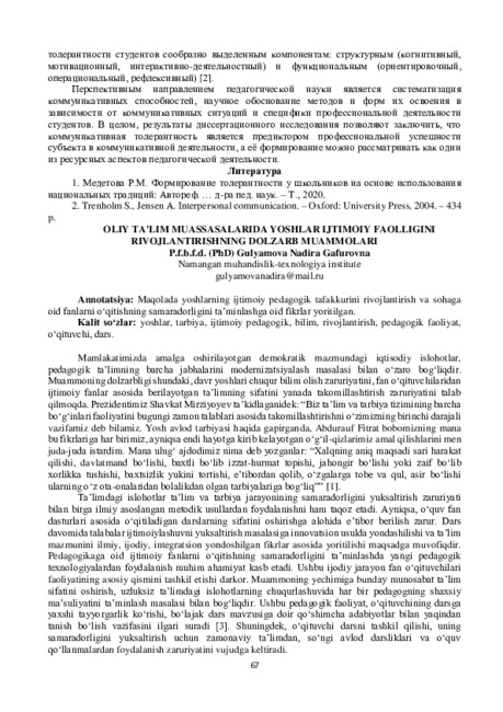 Ushbu maqolada yoshlarning ma’naviy-ahloqiy tarbiyasi bilan oila, mahalla, ta’lim muassasalari, ommaviy axborot vositalari, huquqni muhofaza qiluvchi tashkilotlar, ilmiy-pedagogik kadrlar tarbiya jarayoni bilan barcha ishtirokchilarining bahamjihatlik bilan olib boradigan ishlarigina o‘zining ijobiy natijalarini berishi mumkin.Ularning aktivligini maqsadga muvofiq o‘zgartirish, ularga ba’zi xuquqlarni berish yo‘li bilan ularga ta’sir o‘tkazish haqida mulohaza yuritilgan.