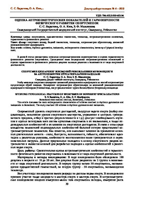 • В данной статье рассмотрены основные антропометрические характеристики и оценка гармоничности физического развития спортсменок. Проведенное нами исследование антропометрических показателей и оценки гармоничности физического развития девушек выявили различия в зависимости от вида спортивной деятельности.