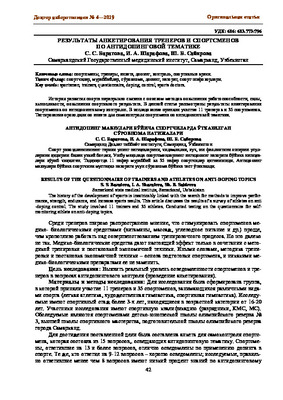 • История развития спорта неразрывно связана с поиском методов повышения работоспособности, силы, выносливости, повышения спортивного результата. В данной статье рассмотрены результаты анкетирования спортсменов по антидопинговому контролю. В исследование приняли участие 11 тренеров и 35 спортсменов. Тестирование проводили по анкете для самоконтроля спортсмена по антидопинговой тематике.