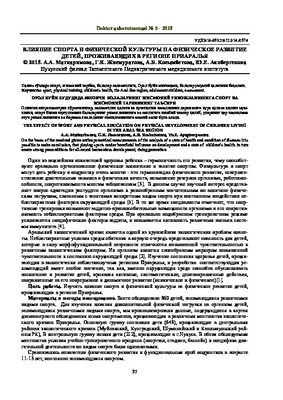 • Здоровье человека во многом определяется уровнем физического развития и функциональных возможностей организма, основы которых закладываются в детском возрасте. Спорт может дать подростку очень много - эта гармонизация физического развития, совершенствование двигательных навыков и физических качеств, повышение резервов организма, работоспособности, сопротивляемости многим заболеваниям. Цель исследования: Сравнительная оценка физического развития подростков в возрасте 14 лет мужского пола города Нукус Республики Каракалпакстан, занимающиеся и не занимающиеся спортом.
