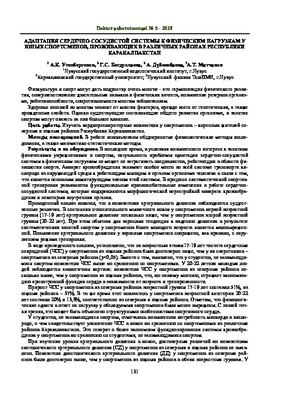 • Физкультура и спорт могут дать подростку очень многое - это гармонизация физического развития, совершенствование двигательных навыков и физических качеств, повышение резервов организма, работоспособности, сопротивляемости многим заболеваниям. Здоровье юношей во многом зависит от многих факторов, прежде всего от генетических, а также врожденных свойств. Однако существующие составляющие общего развития организма, и занятия спортом могут оказать на них большое влияние. Цель работы. Изучить кардиореспираторные показатели у спортсменов - коренных жителей северных и южных районов Республики Каракалпакстан.