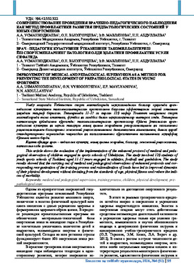 • В данной статье показана оценка внедрения усиленного протокола врачебно-педагогического наблюдения за детьми, занимающимися в спортивных школах Узбекистана. В исследовании приняли участие 120 учащихся детско-юношеских спортивных школ г.Ташкента в возрасте 11-17 лет, занимающихся легкой атлетикой, футболом и ганбдолом. Результаты исследования показали, что проведение медико-педагогических наблюдений по усиленным протоколам и соответствующая реорганизация тренировочного процесса и рационализация нагрузок привели к улучшению динамики их физического развития без отклонения от нормативов возраста, физической подготовленности и снижения показатели заболеваемости.