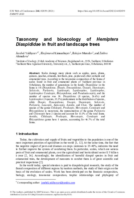 • Чешуя повреждает многие растения, такие как яблони, груши, сливы, айва, персики, миндаль, боярышник, сосна, тополь и другие сады и декоративные деревья. По таксономическому составу фауны чешуек, встречающихся у плодовых и декоративных растений Ташкентской области Узбекистана, число поколений семейства Diaspididae в фауне составляет 18 (Diaspidiotus, Diaspis, Dynaspidiotus, Unaspis, Shansiaspis, Salicicola, Parlatoria, Lepidosapis, Lepidosaphes, Lepidosaphes, Lepidosaphes Carulaspis, Rhizaspidiotus, Pseudaulacaspis), а число видов составило 30. В распространении видов преобладают Diaspidiotus (8 видов, 26,6%) и Lepidosaphes (4 вида, 13,3%), а Diaspis, Dynaspidiotus, Unaspis, Shansiaspis, Salicicola, Parlatoria, Leucaspis, Aulacaspis, Aonidia и Chon. Численность видов родов Chlidaspis, Prodiaspis, Mercetaspis, Carulaspis и Rhizaspidiotus монотипна, представители рода Parlatoria и Chionaspis имеют по 2 вида и составляют 13,3% всей фауны. Роды Aonidia, Chlidaspis, Prodiaspis, Mercetaspis, Carulaspis и Rhizaspidiotus насчитывают по 1 виду, что составляет 46,7% всей фауны.