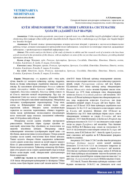 • В данной статье проанализирована история изучения эймерий кроликов и научно-исследовательские работы ученых, активно пропагандирующих это заболевание, с акцентом на некоторых ооцистах, вызывающих заболевание, с предоставлением подробной информации о них.