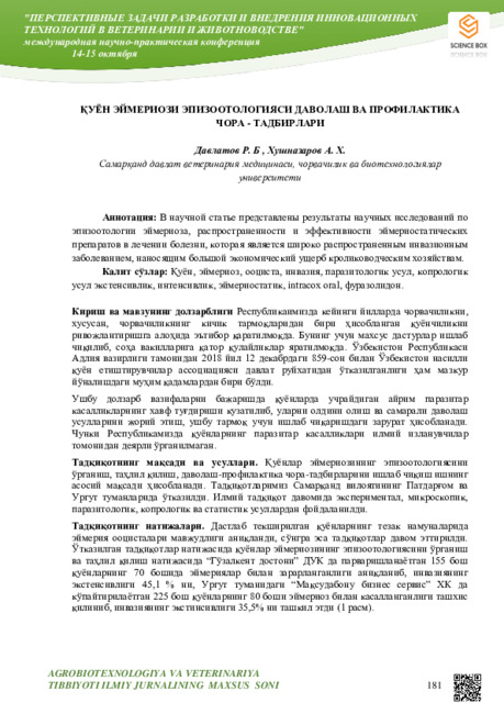 • В научной статье представлены результаты научных исследований по эпизоотологии эймериоза, распространенности и эффективности эймериостатических препаратов в лечении болезни, которая является широко распространенным инвазионным заболеванием, наносящим большой экономический ущерб кролиководческим хозяйствам.