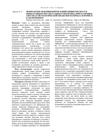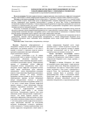 • Цель исследования. Изучение морфологических и морфометрических показателей клеток диффузной эндокринной системы тонкой кишки и степени минерализации бедренной кости у кроликов и морских свинок старческого возраста. Материал и методы исследования. Изучена тонкая кишка у 5 крольчих 6-7-летнего возраста и у 6 морских свинок-самок 5-6-летнего возраста. Криостатные срезы из нефиксированного материала обработаны раствором глиоксиловой кислоты, парафиновые срезы окрашены гематоксилином и эозином, по методу Ван- Гизона и импрегнированы азотнокислым серебром по Гримелиусу. Степень минерализации бедренной кости определяли сравнением веса золы после сжигания ее к первоначальному весу костей в процентах. Плотность распределения эндокринных клеток определяли точечным методом на стандартной площади. Результаты. Установлено достоверное уменьшение числа (плотность распределения) эндокринных клеток слизистой оболочки и снижение степени минерализации бедренной кости у старых крольчих и морских свинок - самок. Обнаружены дегенеративные изменения некоторых эндокринных клеток в виде вакуолизации их цитоплазмы и снижения степени флюоресценции эндокринных клеток открытого типа старых лабораторных животных. Заключение. В стенке тонкой кишки старых крольчих и морских свинок - самок происходит уменьшение плотности распределения, снижение степени флюоресценции эндокриноцитов и степени минерализации бедренной кости. Отмечается параллелизм между изменением числа эндокринных клеток стенки тонкой кишки и минерализацией бедренной кости.
