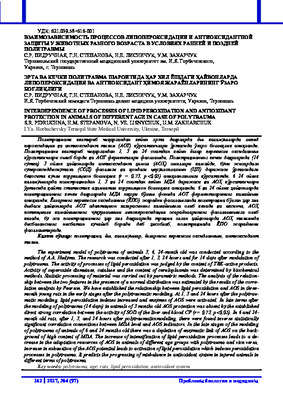 • Эксперимент на модели политравмы животных 3, 6, 24 мес проводили по методике А.А. Гудыма. Исследования проводились через 1, 3, 24 часа и в течение 14 дней после модуляции политравмы. Об активности процессов перекисного окисления липидов судили по содержанию ТБК-активных продуктов.Активность супероксиддисмутазы, каталазы и содержание церулоплазмина определяли биохимическими методами. Статистическую обработку материала проводили параметрическими методами. Анализ связи между двумя признаками при наличии нормального распределения оценивался по результатам корреляционного анализа Пирсона. Нами установлена ​​взаимосвязь между перекисным окислением липидов и АОС у трехмесячных крысят на ранних сроках после моделирования политравмы. Через 1, 3 и 24 часа после моделирования политравмы повышались показатели перекисного окисления липидов и активировались ферменты АОС. В поздние сроки после при моделировании политравмы (14 сут) у животных 3-месячного возраста защита АОС отсутствовала за счет установленной прямой сильной зависимости между активностью СОД печени и ЦП крови (r= 0,73, р 0,05). У 6- и 24-месячных крыс через 1, 3 и 24 часа после моделирования политравмы обнаружены обратные статистически достоверные корреляционные связи между уровнем МДА и показателями АОС. На поздних этапах моделирования политравмы животных 6 и 24 мес отмечалось истощение ферментативного звена АОС на фоне повышенного содержания МДА. Нарастание интенсификации процессов перекисного окисления липидов приводит к де-увеличение адаптационных ресурсов АОС у животных разных возрастных групп с политравмой и, наоборот, увеличение истощения потенциала АОС приводит к активации процессов перекисного окисления липидов, что индуцирует процессы перекисного окисления при политравме. Это позволяет прогнозировать прогрессирование дисбаланса антиоксидантной системы у травмированных животных в различные сроки политравмы.