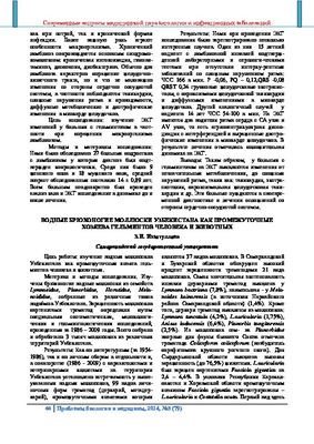• Изучение водных моллюсков Узбекистана как промежуточных хозяев гель-минтов человека и животных. Материал и методы исследования. Изу-чены брюхоногие водные моллюски из семейств Lymnaeidae, Planorbidae, Horatidae, Mela-noididae, собранные из различных типов водоёмов Узбекистана. Зараженность моллюсков партенитами трематод определяли путем специальных систематических, малокологи-ческих и гельминтологических исследований, проведенных за 1986 – 2009 годы. Всего собрано и обработано 3 тысяч моллюсков из различных территорий Узбекистана.