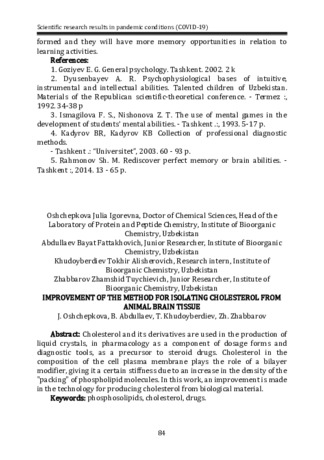 • Cholesterol and its derivatives are used in the production of liquid crystals, in pharmacology as a component of dosage forms and diagnostic tools, as a precursor to steroid drugs. Cholesterol in the composition of the cell plasma membrane plays the role of a bilayer modifier, giving it a certain stiffness due to an increase in the density of the "packing" of phospholipid molecules. In this work, an improvement is made in the technology for producing cholesterol from biological material