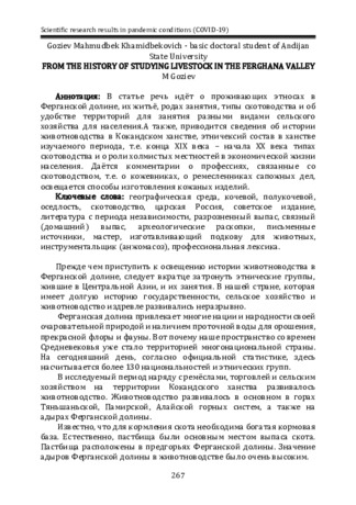 • В статье речь идёт о проживающих этносах в Ферганской долине, их житьё, родах занятия, типы скотоводства и об удобстве территорий для занятия разными видами сельского хозяйства для населения.А также, приводится сведения об истории животноводства в Кокандском ханстве, этничексий состав в ханстве изучаемого периода, т.е. конца XIX века – начала XX века типах скотоводства и о роли холмистых местностей в экономической жизни населения. Даётся комментарии о профессиях, связанные со скотоводством, т.е. о кожевниках, о ремесленниках сапожных дел, освещается способы изготовления кожаных изделий.