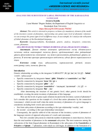 • Данная статья посвящена предложению схемы обязательного элемента модели инвентарной системы фонем, представляющей один родовидовый уровень фонематических отношений: мы можем расположить родовидовый уровень по-разному. В качестве примера проанализируем подсистему губных фонем каракалпакского языка.