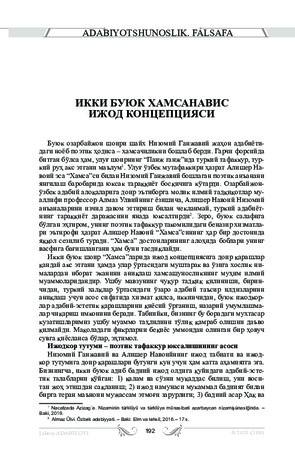 Одной из важных научных проблем навоиведения является исследование обоснования того, как отражаются взгляды касательно творческой концепции и на какие художественно-эстетические критерии они обоснованы в “Хамсе” великого поэта и мыслителя Алишера Навои. Исследование этой научной проблемы, во-первых, является основой для определения истоков мировоззрения великого поэта, а во-вторых, позволяет глубже изучить литературно-эстетические воззрения великого мыслителя, сделать теоретические обобщения. Естественно, наши краткие наблюдения по этому поводу не претендуют на то, чтобы полностью охватить анализ проблемы. Мы постараемся осветить некоторые важные аспекты этого вопроса.