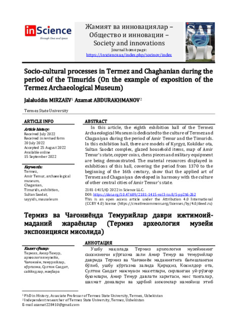 В данной статье описан восьмой выставочный зал Термезского археологического музея, который посвящен культуре Термеза и Чаганиана в период правления Амира Темура и Тимуридов. В этом выставочном зале представлены макеты комплексов Кирккиз, Кокилдорота и Султан Саодат, глазурованные предметы быта, карта государства Амира Темура, медные монеты, шахматные фигуры, военная техника и другие. Представленные в экспозиции этого зала материальные источники, охватывающие период с 1370-х до начала XVI века, свидетельствуют о том, что прикладное искусство Термеза и Чаганиана развивалось в гармонии с культурой других центральных городов государства Амира Темура.