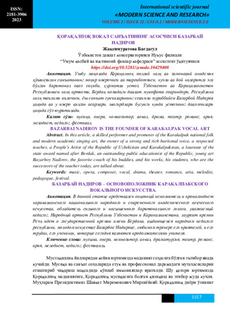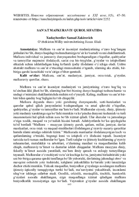 Область применения - материалы диссертации могут быть использованы в лекционных курсах «Основы узбекской традиционной музыки», «Музыкальная культура народов восточных стран», «Музыкальное искусство Узбекистана» в высших и средних специальных учебных заведениях Республики Узбекистана.