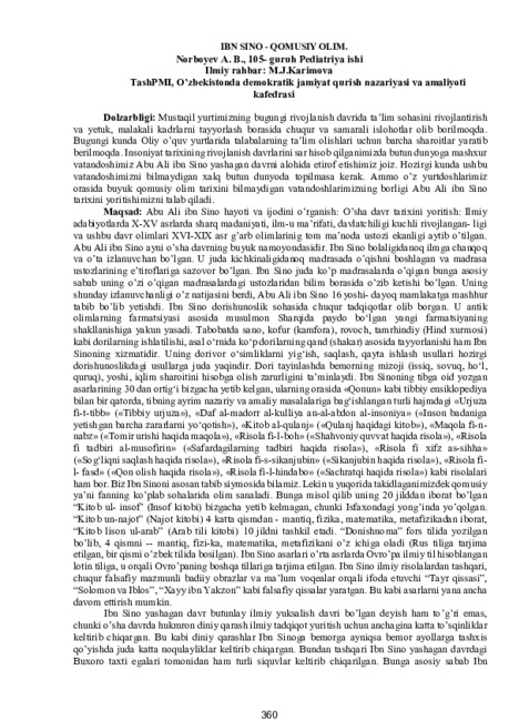 Mustaqil yurtimizning bugungi rivojlanish davrida ta’lim sohasini rivojlantirish va yetuk, malakali kadrlarni tayyorlash borasida chuqur va samarali islohotlar olib borilmoqda. Bugungi kunda Oliy o’quv yurtlarida talabalarning ta’lim olishlari uchun barcha sharoitlar yaratib berilmoqda. Insoniyat tarixining rivojlanish davrlarini sar hisob qilganimizda butun dunyoga mashxur vatandoshimiz Abu Ali ibn Sino yashagan davrni alohida etirof etishimiz joiz. Hozirgi kunda ushbu vatandoshimizni bilmaydigan xalq butun dunyoda topilmasa kerak. Ammo o’z yurtdoshlarimiz orasida buyuk qomusiy olim tarixini bilmaydigan vatandoshlarimizning borligi Abu Ali ibn Sino tarixini yoritishimizni talab qiladi.