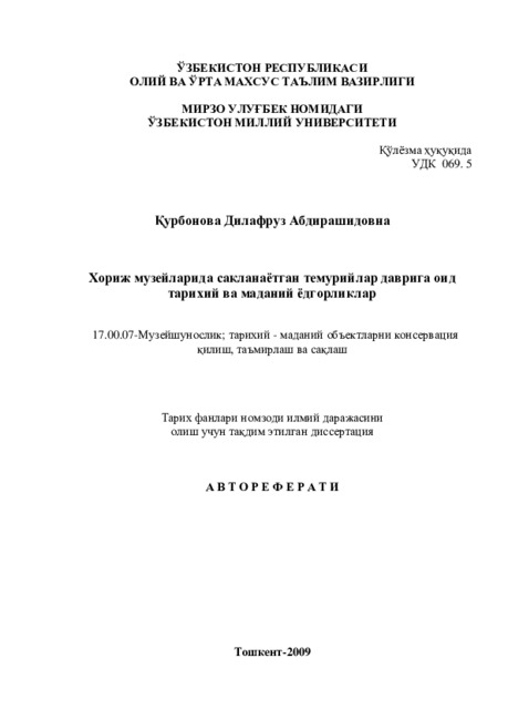 Полученные результаты и их новизна: впервые исследованы на основе различных первоисточников исторические и культурные памятники эпохи темуридов, хранящиеся в зарубежных музеях; составлен и внесён в научное обращение список исторических памятников XIV-XV веков, находящихся в Узбекистане и в музеях зарубежных стран.