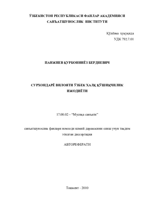 Объект исследования - обрядовые, трудовые, сезонные и необрядовые народные песни Сурхандарьинской области; образцы «вторичного фольклора» из репертуара фольклорно-этногрфических ансамблей.