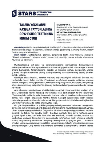 Ushbu maqolada bo‘lajak boshlang‘ich sinf o‘qituvchilarining o‘qish darsini tashkil etishda hikoya va ertaklarni sahnalashtirishda qo‘g‘irchoq teatrining muhim jihatlari haqida keng to‘xtalib o‘tilgan.