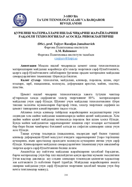 Мақола ишлаб чиқаришда цемент олиш технологиясида материалларни майдалаш жараёнида кўп электр энергияси сарф бўлаётганлиги, қаерга сарф бўлаётганлиги сабабларини ўрганиш орқали материални майдалаш самарадорлигини таъминлаш тўғрисида ёзилган.