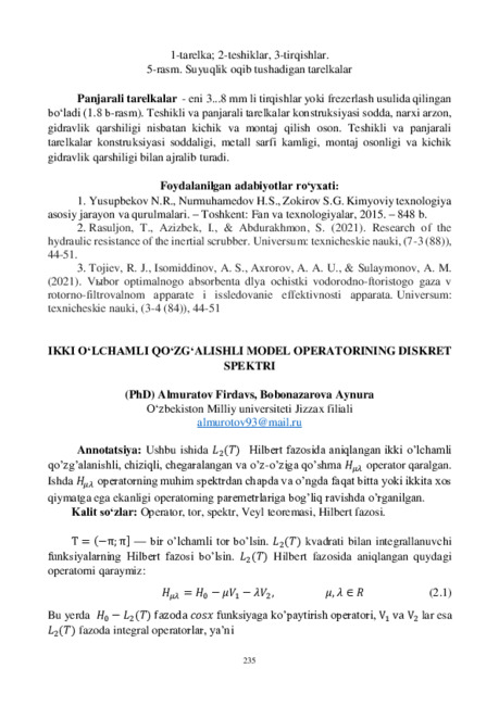 Maqolada sanoat ikkilamchi tashlama gazlarini yuvib tozalovchi qurilmalar ishchi organlarini nazariy tadqiqot etish ishlari keltirilgan. Ishchi suyuqlikni purkovchi mehanizmni jarayonga qo‘llash bo‘yicha tavsiyalar yoritilgan.