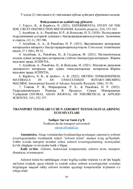 Aloqa vositalaridan foydalanishga asoslangan zamonaviy axborot texnologiyalaridan foydalanish tufayli "axborot tizimi" atamasi keng qo'llaniladi. Ushbu tezisda transport tizimlari uchun axborot texnologiyalarining xususiyatlari ko’rib chiqilgan va tavsiyalar berib o’tilgan.