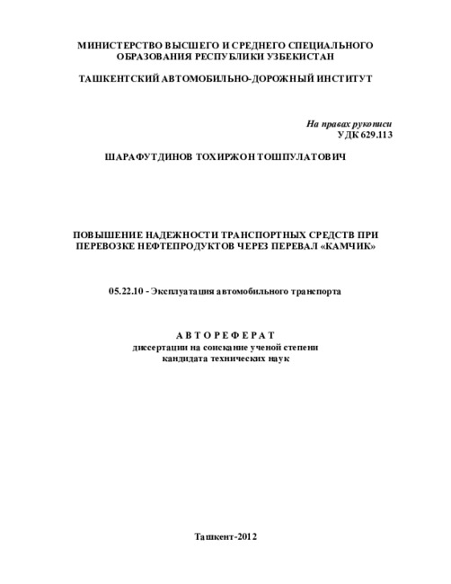 Ишнинг максадн: “Қамчиқ” довопи оркали пефт махсулотарипи ташишда транспорт воситаларипипг копструкциясипи такомиллаштириш ва эксплуатацией ишончлиигипи ошириш хисобига автомобиллар техник эксплуатация™ самарадорлигига эришиш.